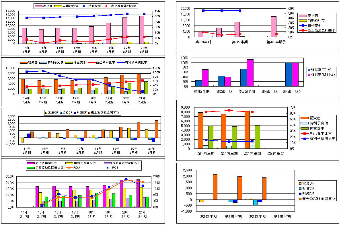 過去の経営成績を見ると、粗利益率は過去8年で約47%から約55%まで上昇している。売上高営業利益率は、平成15年2月期に1%に落ちているが、これは前期における直営出店や靴下製造の後工程の合理化機械及び自動リンキング機に絡む研究開発がかさんだため。翌期からは、徐々に営業利益率が高くなり20年2月期には12.4%まで上昇している。財務面では、14年2月期に100%を超えていた有利子負債比率が、今期第三四半期終了時に12.2%まで減少しており、強固な財務基盤を確保している。