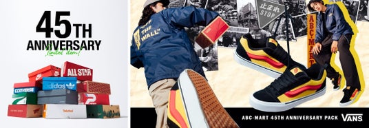 今年、創業45周年を迎えたABC-MARTは、記念すべきアニバーサリーイヤー企画として、11にもおよぶブランドとタッグを組み、45周年限定モデルを制作し、7月より順次発表しています。