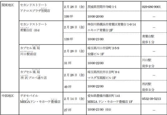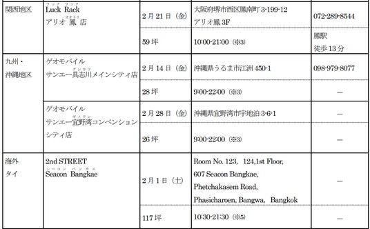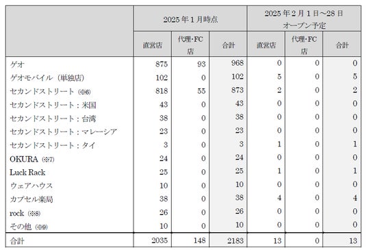 新たに、「セカンドストリート」3店舗、「ゲオモバイル」5店舗、「ラックラック」1店舗、「カプセル楽局」4店舗の合計13店舗が2025年2月度にオープンします。