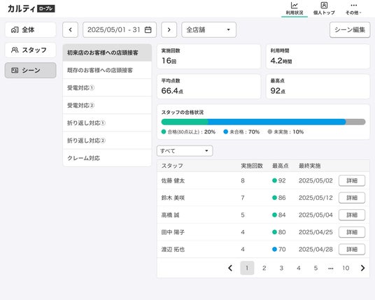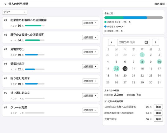 よく使用されているシナリオやスコアが高い・低い場面を可視化することで、現場で重点的に使われている対応パターンやトレーニング内容が整理されます。こうしたデータは、研修内容の見直しや、顧客満足・売上向上との関連性を捉える際にも活用でき、人材育成が経営にどう貢献しているかを具体的に示す材料となります。