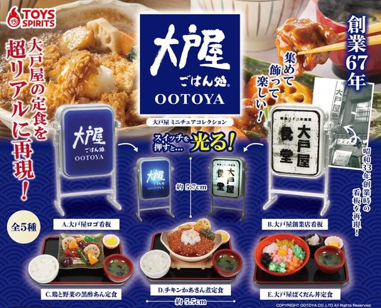 本商品は、株式会社大戸屋が販売する人気定食や創業67周年(創業昭和33年)当時からの看板を全高約55mmで再現した驚きのリアル感満載なカプセルトイです。見た目はもちろん、ロゴ看板と創業店看板はスイッチで光る仕様となっております。見ているとついつい大戸屋の商品が食べたくなってしまう商品です。種類は「大戸屋ロゴ看板」、「大戸屋創業店看板」、「鶏と野菜の黒酢あん定食」、「チキンかあさん煮定食」、「大戸屋ばくだん丼定食」の全5種類です。