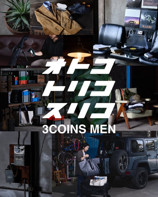 男性のお客様にももっと3COINSを身近に・・・生活雑貨をはじめデバイス関連グッズ、CARアイテム、ビジネス雑貨、服飾雑貨など100アイテム以上をラインナップ。