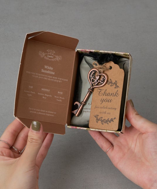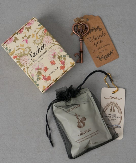 「ホワイトサンシャイン サシェ」に、鍵のかたちをしたボトルオープナーがセットになった特別なアイテム。贈り物にもおすすめです。