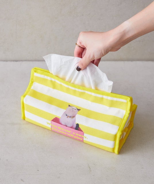 猫の「ぷっ」をプリントしたティッシュカバー。印象的な太めのボーダーの中に、「ぷっ」が入り込んだなんとも可愛いデザイン。一般的なティッシュボックスがぴったり入るサイズです。サイドに紐がついているので、フックなどにかけて使うこともできます。