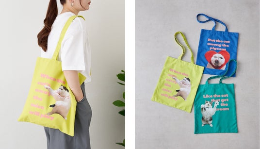 A4サイズがすっぽり収納でき、バッグの中には内ポケットもついています。持ち手は長めに設計しているので、肩から掛けられ使いやすさも抜群。キュートなお顔やユニークな動きの猫たちをプリントした、キャッチーで目をひくトートバッグです。