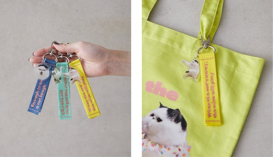 3匹のキュートな猫たちをプリントしたアクリルキーホルダー。鮮やかなカラーのテープには猫にまつわるイディオムを刺繍し、ユニークな動きをした猫のアクリルチャームをセットにしました。トートバッグにつけて使えばさらにキュート!