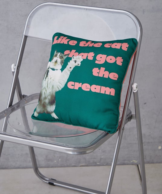 猫の「ぼっこ」をプリントした色鮮やかなクッション。グリーン地にピンクの文字を合わせ、お部屋のアクセントになるクッションに仕上げました。やや小さめのサイズなので、デスクや車の中で使うのもおすすめです。