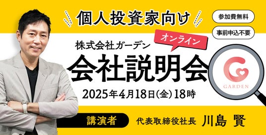 株式会社ガーデン(本社:東京都新宿区 代表取締役社長:川島賢 以下「当社」) は、2025年4月18日(金)18時より、個人投資家向けオンライン会社説明会を開催いたします。