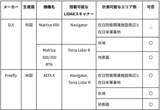 テラドローンは、国内外での豊富な実績をもとに、最先端のドローン測量サービスを提供しています。特に、グリーンレーザ(※2)や赤外線レーザを搭載したドローンによる測量技術を強みに、陸上や水中の複雑な地形・構造物の高精度な3次元データ取得を可能にしています。一方で、従来使用していた「Matrice 300/350 RTK」および「Matrice 600」は、日本国内の防衛関連施設が写り込む可能性のある測量案件では、情報セキュリティ上の観点から使用が制限されるケースもありました(図1)。