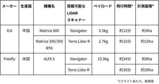 図1: テラドローンが使用する各機種の主な特徴