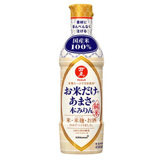 「お米だけのあまさの本みりん」は、原材料にこだわり、糖類を使用せず、米・米麹・酒だけでつくりました。お米の甘みとうま味を引き出した純米本みりん(*1)です。国産米を100%使用し、国内で醸造しています。米麹を通常のみりんの3倍(*2)使用しているため、お米由来のうま味成分である「アミノ酸」が豊富に含まれています。