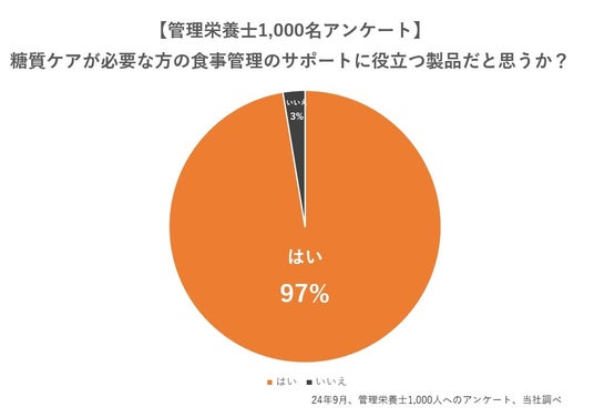 さらに、管理栄養士1,000名に対して行ったアンケートでは、1,000名中974名(97%)が「糖質ケアが必要な方の食事管理のサポートに役立つ製品だと思う」と回答しました。「農村で自ら収穫したおいしいお米を食べておられる方が多いエリアで働いているが、そのお米に簡単にプラスできる」「わかっていても食べちゃうという方に良い」というコメントも得られました。