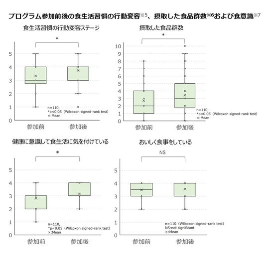 当社の不規則な勤務時間帯の従業員(夜勤、営業(外勤))を中心とした参加者110名に対して、約3カ月間検証を行った結果、健康な食生活への意識の改善、食生活や運動習慣の行動変容、および摂取した食品群数の増加などが認められました。また、健康的な食生活の改善においては食事制限等がストレスになることも想定された中、参加者が「おいしく食事をする」との意識を損なわずに取り組んでいる姿勢が見られました。この結果を踏まえ、当社は「しっかり食べチェック(R)プログラム」を、社員食堂を利用できない様々な勤務形態の従業員への健康増進に向けた行動変容プログラムとして検討し、健康経営の取り組みサポートを図ります。 また研究成果の詳細は、2025年1月17日~19日に国立京都国際会館で行われる第28回日本病態栄養学会年次学術集会において発表します。