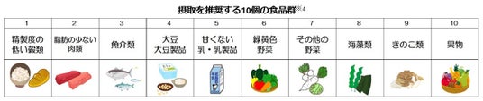 ※4) 肥満症治療、動脈硬化性疾患予防ガイドライン、既知情報(名古屋学芸大健康・栄養研究所年報第二号2008年)の食品群 から、推奨する10個の食品群(1.精製度の低い穀類2.脂肪の少ない肉類3.魚介類4.大豆・大豆製品5.甘くない乳・乳製品6.緑黄色野菜7.その他の野菜8.海藻類9.きのこ類10.果物)を選定。