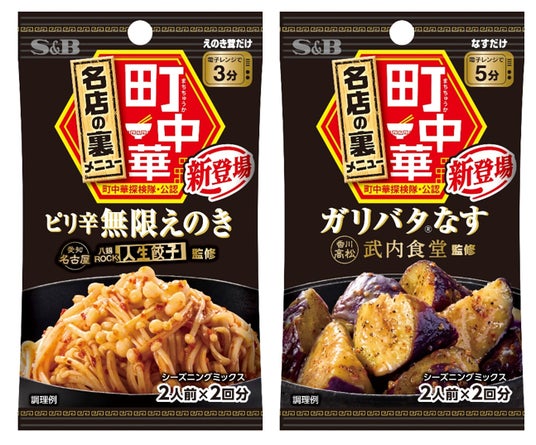 エスビー食品株式会社は、町中華の名店の裏おつまみメニューが手軽に楽しめる「町中華シーズニング」シリーズより、「ピリ辛無限えのき」「ガリバタ(R)なす」を新発売します。