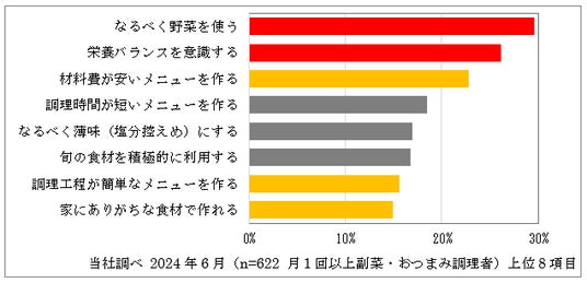 副菜やおつまみの調理に対し、「なるべく野菜を使う」「栄養バランスを意識する」とのお客さまの声が多く、野菜摂取への高い意識がうかがえます。加えて、「材料費が安い」「調理工程が簡単」「家にありがちな食材で作れる」へのニーズが高いことから、「えのき」と「なす」に着目しました。