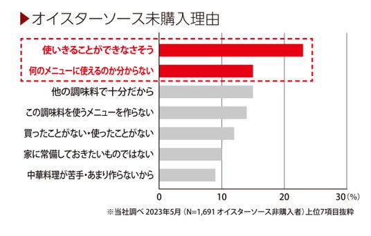 オイスターソースに対しては、「使い切ることができない」「どのメニューに使用すればよいか分からない」などの理由で購入をためらう方がいることがうかがえます。