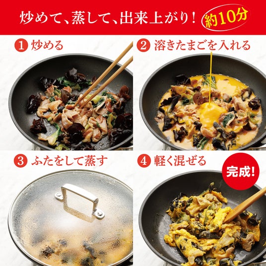 ラインアップは、「豚肉ときくらげの卵炒め」「牛肉と卵のオイスターソース炒め」「豚にら玉」の3品で、賞味期間は冷凍で6カ月です。