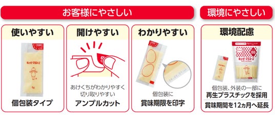 毎日のお弁当がもっと楽しくなるように、デザインを一新個包装の裏面には、マヨネーズやハートなど6種類のイラスト※2が描かれています。お弁当を作った人と食べる人が心温まるひと時を共有するきっかけとして、お弁当・ランチタイムを楽しく彩ります。また1個6gと使い切りやすい容量のため、外出先だけではなく、普段の食卓でも便利に使うことができます。