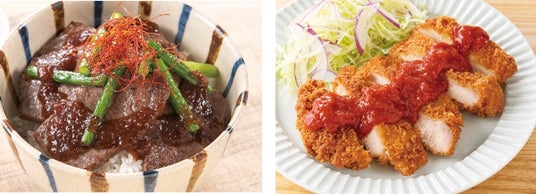 推奨メニュー:左牛カルビ丼 具たっぷり焼肉のたれ 右チキンカツ トマトガーリックソース仕立て
