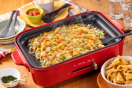 「オタフクソース」とコラボ とんがりコーンもんじゃ焼きもんじゃ焼きの材料に、とんがりコーンを粗めに砕いて加える、もんじゃ焼きの新しい楽しみ方!さくさく食感と濃厚なもんじゃの味わいがマッチします。