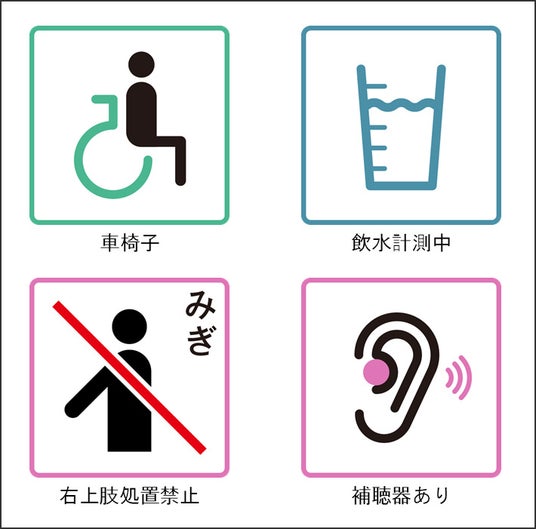 患者の安静度や食事制限など、医療・看護上の個別注意事項をイラスト記号で表示する「ピクトグラム」をリニューアル。カテゴリーごとに色を分け、視覚的により容易に理解できるようになりました。医療従事者間のみならず、患者との間をつなぐコミュニケーションツールとして活用いただくことで、療養生活の安全性を高めます。