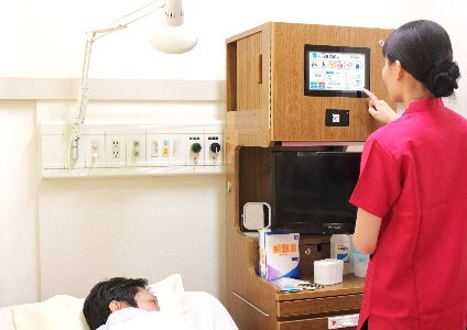 特に感染症で個室管理の患者さんの場合、電子カルテを部屋に持ち込むことなく床頭台に設置されているユカリアタッチ ウィズから直接入力、確認ができるので業務負担軽減に繋がっています。