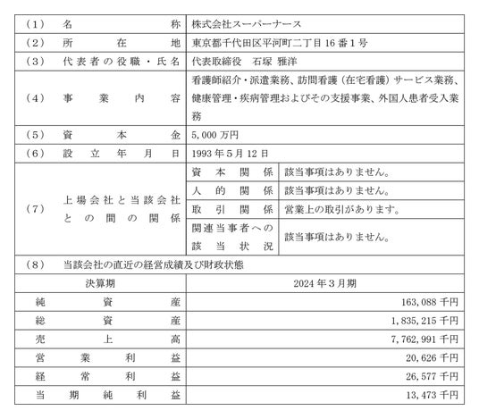 株式会社ユカリア(本社:東京都千代田区、代表取締役社長:三沢 英生、以下「ユカリア」)は、本日開催の取締役会において、以下のとおり、株式会社スーパーナース(本社:東京都千代田区、代表取締役:石塚 雅洋、以下「スーパーナース」)より2025年2月28日に普通株式2,000株を取得し、持分法適用関連会社化とすることについて決議いたしましたのでお知らせします。