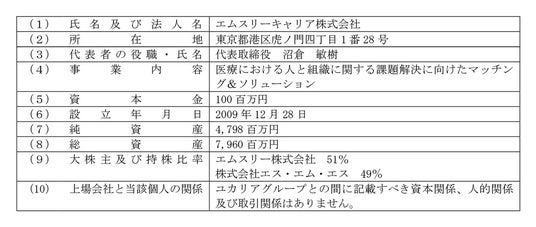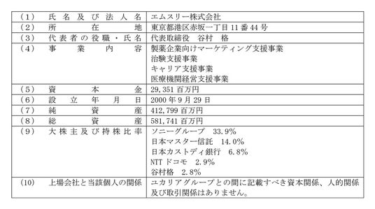 (注)上記のほか、IF Lifetime Ventures投資事業組合、かんしんミライ第2号投資事業有限責任組合、ヘルスケア・ニューフロンティア投資事業有限責任組合、コロプラネクスト7号ファンド投資事業組合が株式取得の相手先となります。うちヘルスケア・ニューフロンティア投資事業有限責任組合は、ユカリアの非連結子会社である株式会社キャピタルメディカ・ベンチャーズが当該ファンドの業務執行組合員を務めております。その他の各組合とユカリアグループとの間に記載すべき資本関係、人的関係及び取引関係はありません。