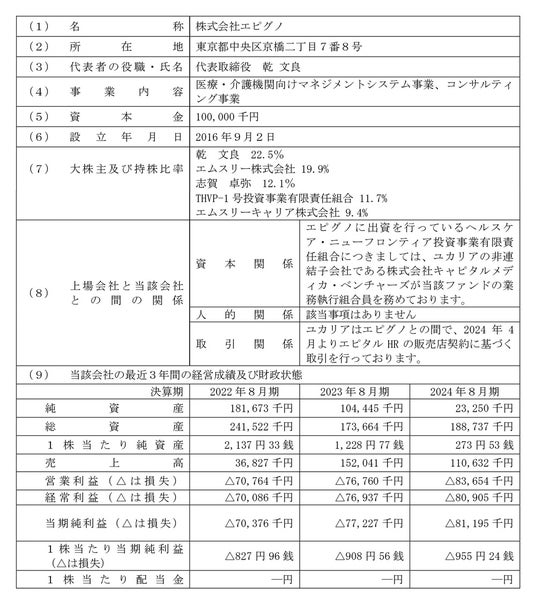 株式会社ユカリア(本社:東京都千代田区、代表取締役社長:三沢 英生、以下「ユカリア」)は、株式会社エピグノ(本社:東京都中央区、代表取締役社長:乾 文良、以下「エピグノ」)の株式を取得して子会社化することを、2025年6月5日の取締役会において決議いたしましたのでお知らせします。