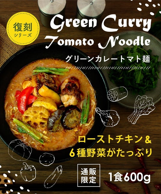 トマト×鶏白湯の濃密スープとエスニックな香りがクセになる伝説のレシピ『グリーンカレートマト麺』を、ECサイト用にアレンジ。大きなローストチキンと彩り豊かな6種の野菜をたっぷり加え、ボリュームたっぷりに仕上げました。
