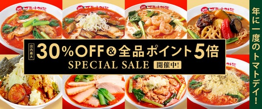 トマトラーメンの専門店「太陽のトマト麺」の年に一度の“トマト祭”を開催いたします。「トマトの日」である10月10日にあわせ、2024年10月9日(水)~10月11日(金)の3日間限定で、お好きなラーメン1杯のご注文につき「太陽のラーメン無料券」を1枚進呈するキャンペーンです。また今年はECサイトでも「トマトの日」にあわせ、最大30%オフ&全品ポイント5倍になる「SPECIAL TOMATO DAY SALE」を開催いたします。ECサイトでは、毎月10日を含める日程で最大30%OFFセールを実施しておりますが、それに加えて全品ポイント5倍となるスペシャルな企画です。