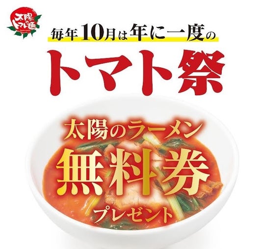 トマトラーメンの専門店「太陽のトマト麺」は、10月10日「トマトの日」にあわせ、2024年10月9日(水)から3日間限定で、お好きなラーメン1杯のご注文につき「太陽のラーメン無料券」を1枚進呈するキャンペーンを開催いたします。また、ECサイトでも「トマトの日」にあわせ、最大30%オフ&全品ポイント5倍になる「SPECIAL TOMATO DAY SALE」を開催いたします。