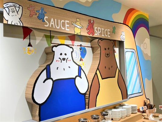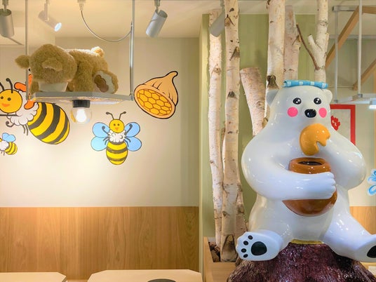 クマの好物と言えば“はちみつ”ですが、「くまちゃん温泉 渋谷本館」には、はちみつかけ放題のハニーバーが登場します。常時4種類以上のはちみつを用意。スイーツはもちろん、唐揚げやポテトとのコンビネーションもお楽しみいただけます。また、大きな木枠のままのハニーコムを店内にディスプレイし、全てのスイーツがオプションでハニーコムを付けられるように。フレッシュで濃厚なハニーコムをお楽しみいただけます。