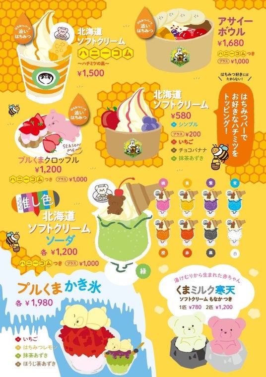 「くまちゃん温泉 渋谷本館」では、ランチタイムとディナータイムの間に、カフェタイムを設けます。これまでの人気だったかき氷や、北海道産乳製品を使ったソフトクリーム、ぷるぷると震えるくまのクロッフルやミルク寒天など新たなラインアップも。ハニーコムオプションやハニーバーではちみつかけ放題とともにお楽しみいただけます。