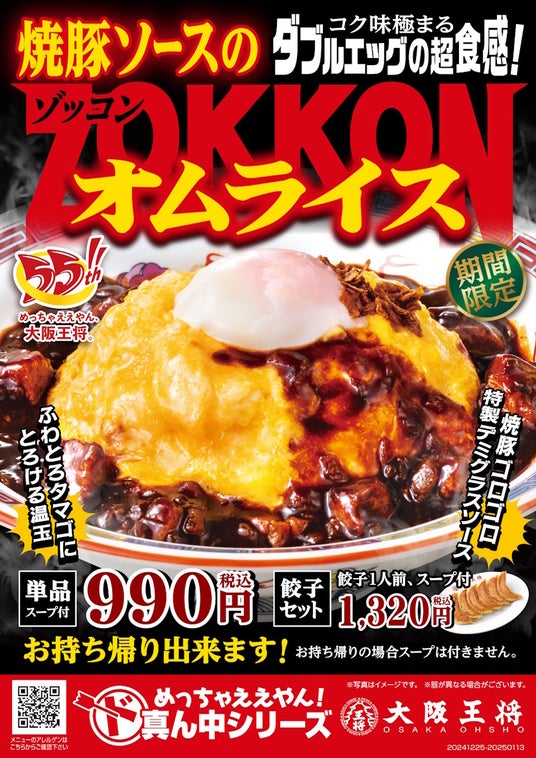 株式会社大阪王将(東京ヘッドオフィス:東京都品川区 代表取締役社長:文野幸司)は、2024年12月25日(水)より大阪王将55周年記念メニューとして『ZOKKONオムライス』を全国の大阪王将にて期間限定で販売いたします。