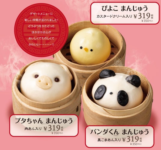 これまで、たんめんや点心など、ボリュームのあるお食事をメインにご提供してまいりましたが、メニューの見直しを行い、甘味や点心も充実いたしました。動物をかたどった点心は、肉あんの他、黒ごまあん、カスタードクリームの3種類。