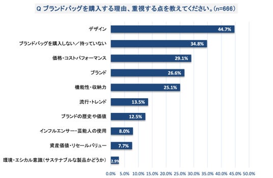 ブランドバッグを購入する際に最も重視されるのは「デザイン」(44.7%)であり、次いで「ブランド」(26.6%)、「価格・コストパフォーマンス」(29.1%)が上位に挙げられました。ファッションアイテムとしての魅力やブランド価値を意識して購入する傾向が強いことが分かります。