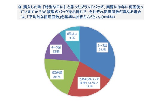 「特別な日に使おう」と思って購入したブランドバッグですが、実際には「年に2~3回しか使っていない」との回答が最も多く、33.4%を占めました。さらに、「1回未満」(20.7%)、「4~5回」(13.8%)と続き、「ほとんど使われていない」ことが明らかになりました。一方、「6回以上」と頻繁に使用している人は9.9%にとどまりました。