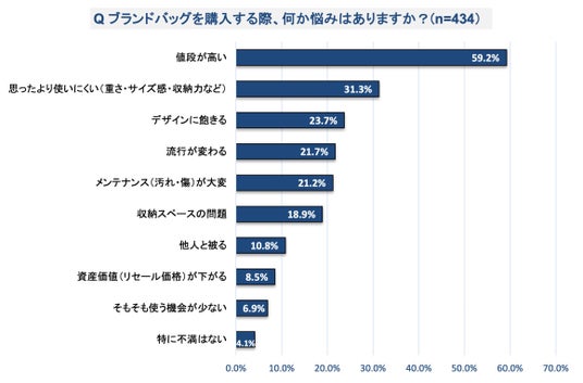 ブランドバッグを購入する際の最大の悩みは「値段が高い」(59.2%)であり、半数以上が価格に対するハードルを感じています。次いで、「思ったより使いにくい(重さ・サイズ感・収納力など)」(31.3%)、「デザインに飽きる」(23.7%)、「流行が変わる」(21.7%)といった、購入後の使い勝手やトレンドの変化に関する不安が挙げられました。