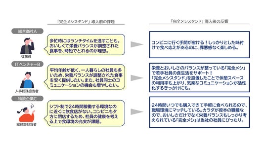 サービス開始から約1年が経過した現在、「完全メシスタンド」は、従業員の健康的な食生活のサポートや、社内コミュニケーションの活性化のための施策として、オフィスをはじめ、工場、病院、ホテル、コールセンター、観光施設などさまざまな企業や施設で利用され、たくさんのご好評の声をいただいています。