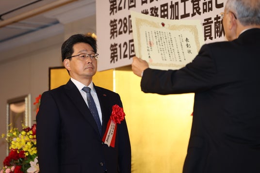 「業務用加工食品ヒット賞」は、株式会社日本食糧新聞社が主催し、全国の有力業務用食品卸によるモニター選考により選出され、業務用卸各団体代表者で構成される選考委員会の審議を経て決定されるものです。外食産業の活性化などに貢献した業務用加工食品や素材の栄誉を称える賞となります。今年は14社が同賞を受賞し、贈呈式では受賞各社へ株式会社日本食糧新聞社 代表取締役会長CEOの今野 正義氏から表彰状が授与されました。