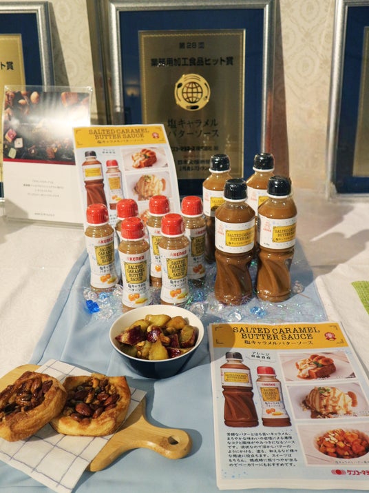 当社商品『塩キャラメルバターソース』は、やみつきになる甘じょっぱいテイストとハンドリングの良さが特長のソースです。かけるだけでなく、塗る、和えるなどの使い方で様々なメニューに使用できる点が評価され、今回の受賞に至りました。手作りするには時間と手間のかかるキャラメルソース。バターを溶かす手間やキャラメルのべたつきがなく、冷やしても固まらずすぐに使用できる本商品は、慢性的かつ深刻な人手不足が課題の外食産業において、オペレーションの簡便化に寄与する商品です。