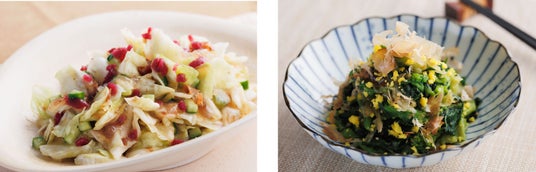 (左)『春キャベツとジュレのおひたし~梅かつお~』(右)『春を味わう 菜の花のおかか和え』