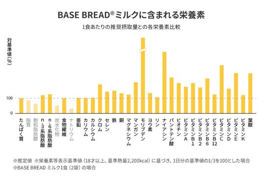 *1 1食分(BASE BREADは2袋、BASE PASTAは1袋、BASE Cookiesは4袋、BASE FOOD Deliは1袋、BASE Pancake Mixは1袋と卵Mサイズ1つ、牛乳(成分無調整)100mlを使用して調理した場合)で、栄養素等表示基準値に基づき、脂質・飽和脂肪酸・炭水化物・ナトリウム以外のすべての栄養素で1日分の基準値の1/3以上を含む
