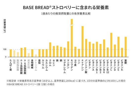 *1 1食分(BASE BREADは2袋、BASE PASTAは1袋、BASE Cookiesは4袋、BASE FOOD Deliは1袋、BASE Pancake Mixは1袋と卵Mサイズ1つ、牛乳(成分無調整)100mlを使用して調理した場合)で、栄養素等表示基準値に基づき、脂質・飽和脂肪酸・炭水化物・ナトリウム以外のすべての栄養素で1日分の基準値の1/3以上を含む
