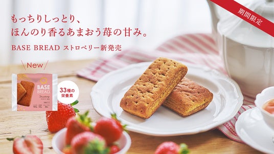 完全栄養の主食※1を開発・販売するベースフード株式会社(本社:東京都目黒区、代表取締役:橋本舜、https://basefood.co.jp)は、1食に必要な33種類の栄養素がすべてとれる全粒粉ベースの完全栄養のパン※2「BASE BREAD(ベースブレッド)」シリーズから、「BASE BREAD ストロベリー」を2024年11月26日(火)より期間限定商品として、公式オンラインショップ(https://shop.basefood.co.jp/)、他ECサイト、取扱販売店にて順次販売開始します。