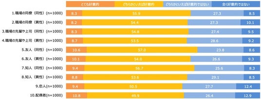 カップ麺のイメージに関する設問では「不健康」「ダサい」などネガティブな項目に対してポイントが高い結果でしたが、同性異性問わず、ご自身の周りの方がカップ麺を食べている姿に対しての意識調査については、全ての項目において過半数以上が「好意的」という意外な結果となりました。