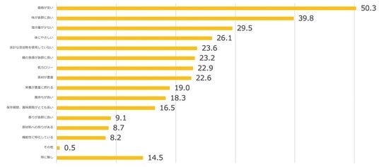 ■ 今後カップ麺に求めたい要素としては「価格が安い(50.3%)」「味が抜群に良い(39.8%)」に次いで、「塩分量が少ない(29.5%)」「体にやさしい(26.1%)」「余計な添加物を使用していない(23.6%)」「低カロリー(22.9%)」と健康に対するニーズと期待が高い結果に。
