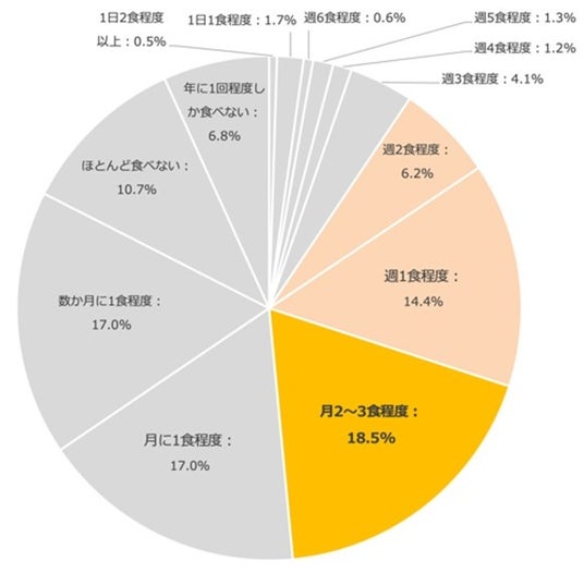カップ麺の喫食頻度は「月2~3食程度(18.5%)」が最も多い一方、「週1食程度(14.4%)」「週2食程度(6.2%)」と頻度高く食べている人も一定いることが分かりました。